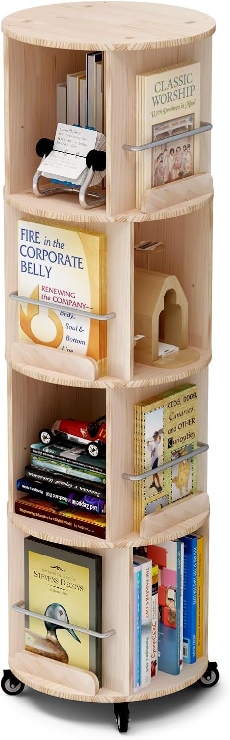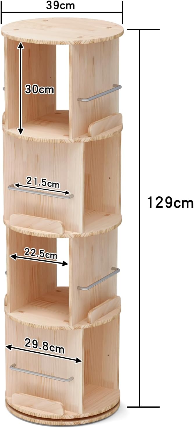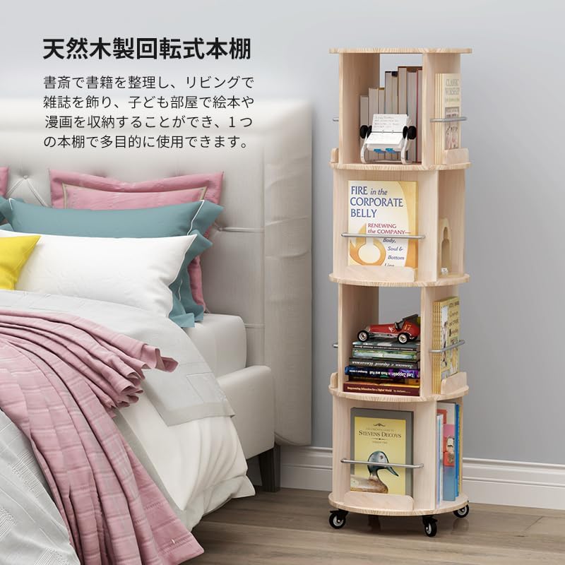 本棚 スリム 回転式本棚 天然木製 360°回転 キャスター付き コミックラック 絵本棚 収納 棚 ラック