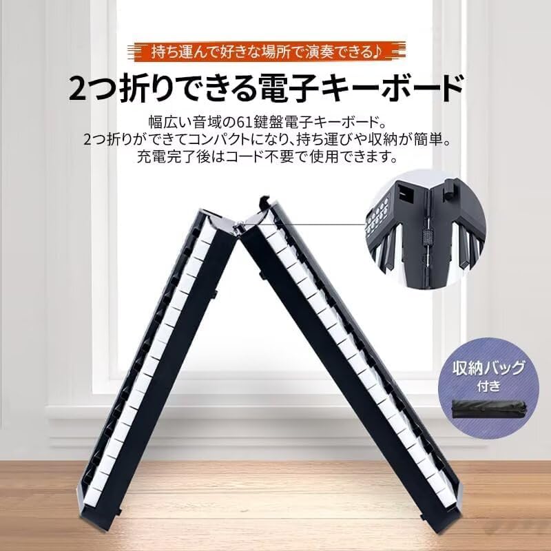 電子ピアノ 61鍵盤 折り畳み式 充電型 MIDI対応 200種音色 二つステレオスピーカ 初心者向け コンパクト